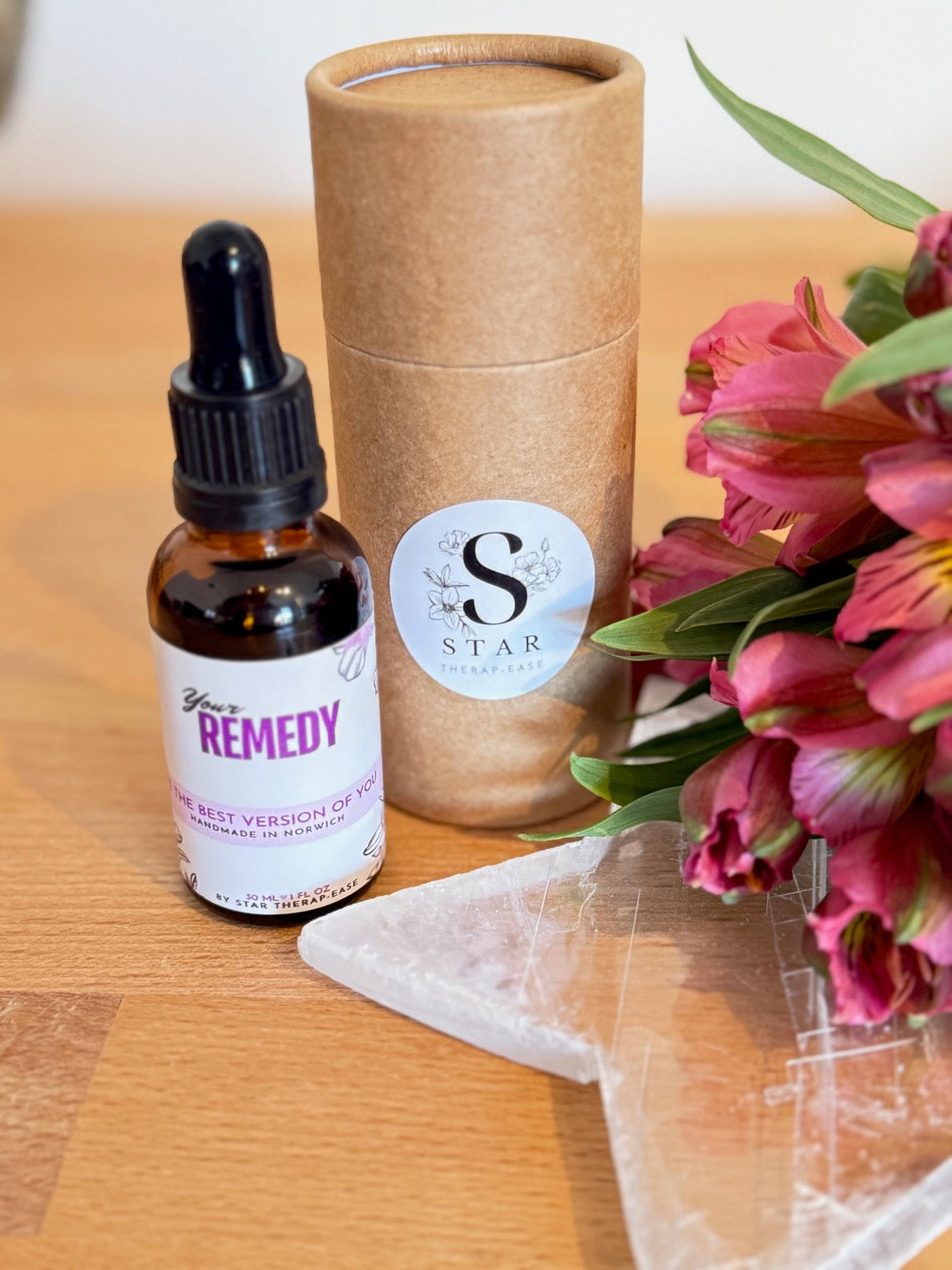 'Your remedy' bottle is then personalised to you, from what we have discussed during the 1 hour consultation, we use organic brandy base (regular) or a glycerine base (alcohol free) to preserve your remedy blend and you can also choose the name you want written on your label too or Alternatively if you have selected not to have one made - you will make a list of the remedies for you to make yourself in your own time once the session has finished.