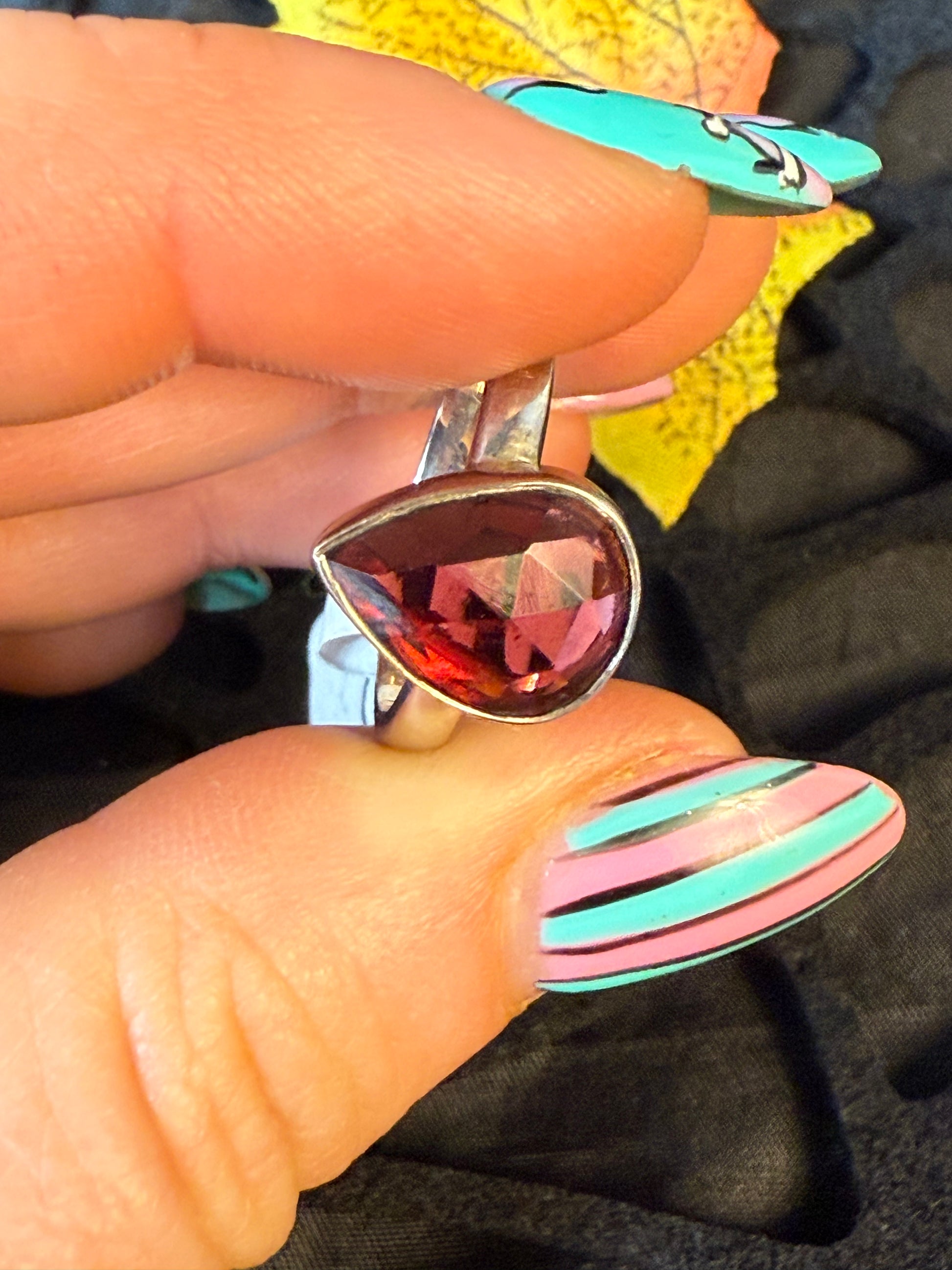 This unique Garnet Facet 925 Silver Ring is a beautiful addition to any collection. Crafted from sterling silver, this ring features a 925 silver band, a faceted-shaped garnet in a size R 1/2 to S. Classic and timeless, this ring will add a touch of Passion and elegance to any outfit.