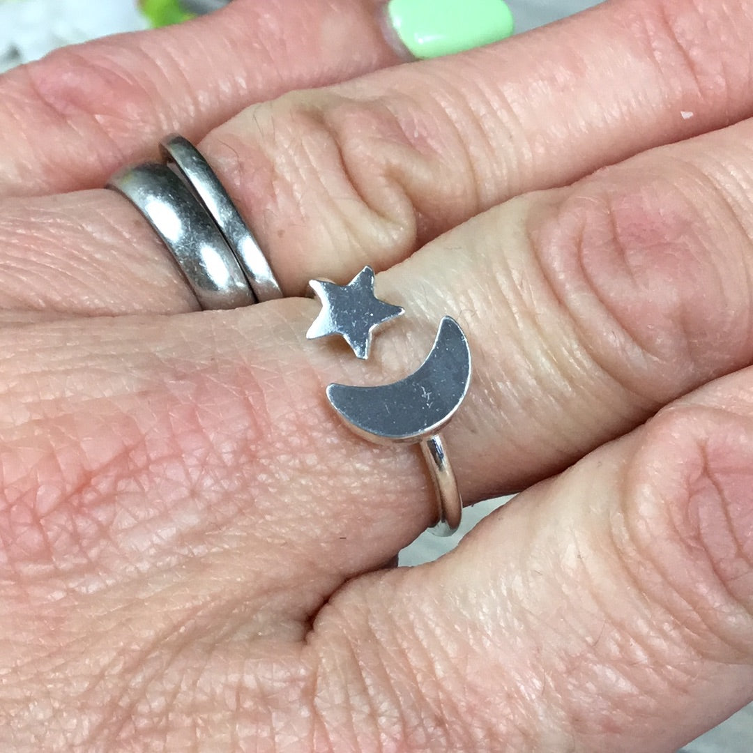 Adjustable Moon & Star 925 Sterling Silver Ring