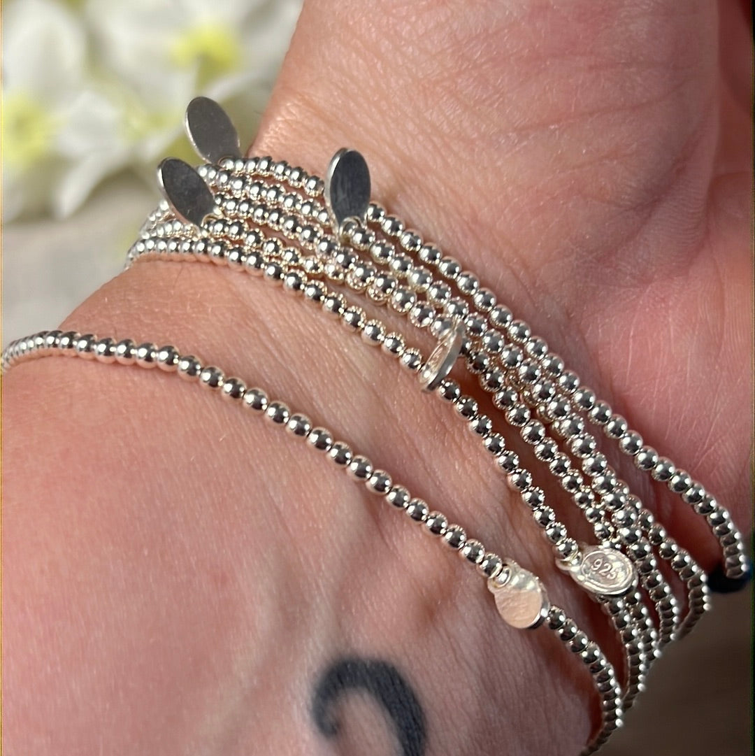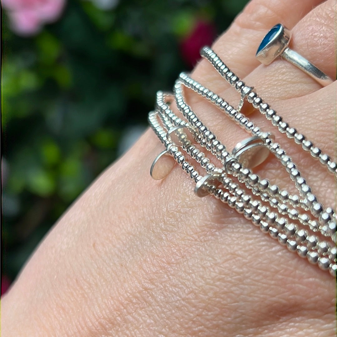 Sterling silver bead topped off with 15 facet crystal beads elastic ! Stunning and dainty