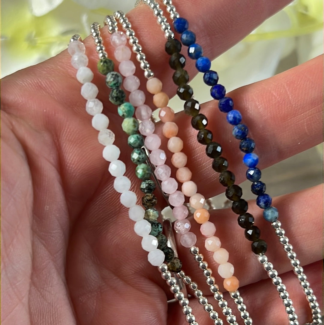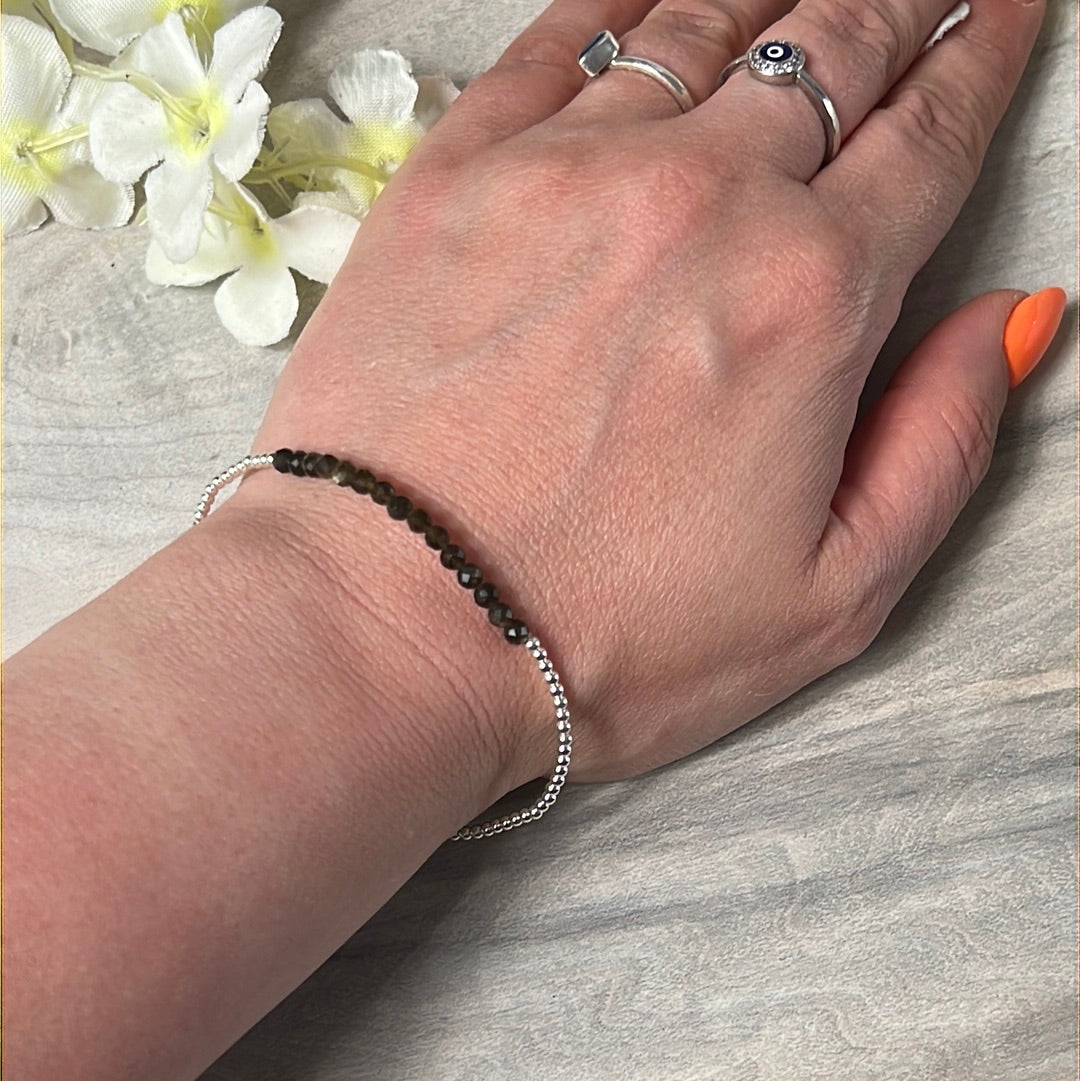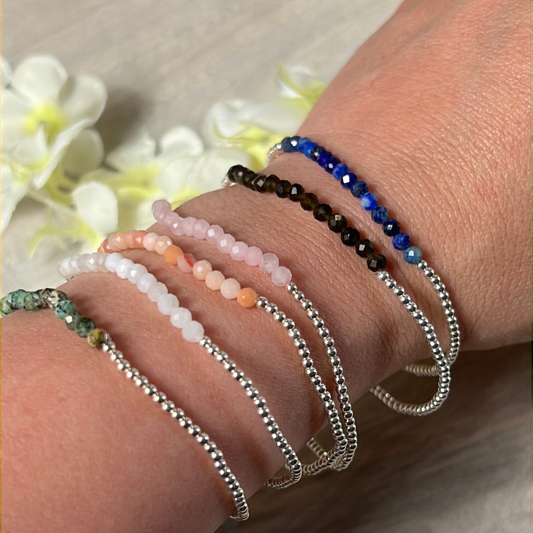 Sterling Bead & Facet Crystal Bracelet - elastic 925 Sterling Silver