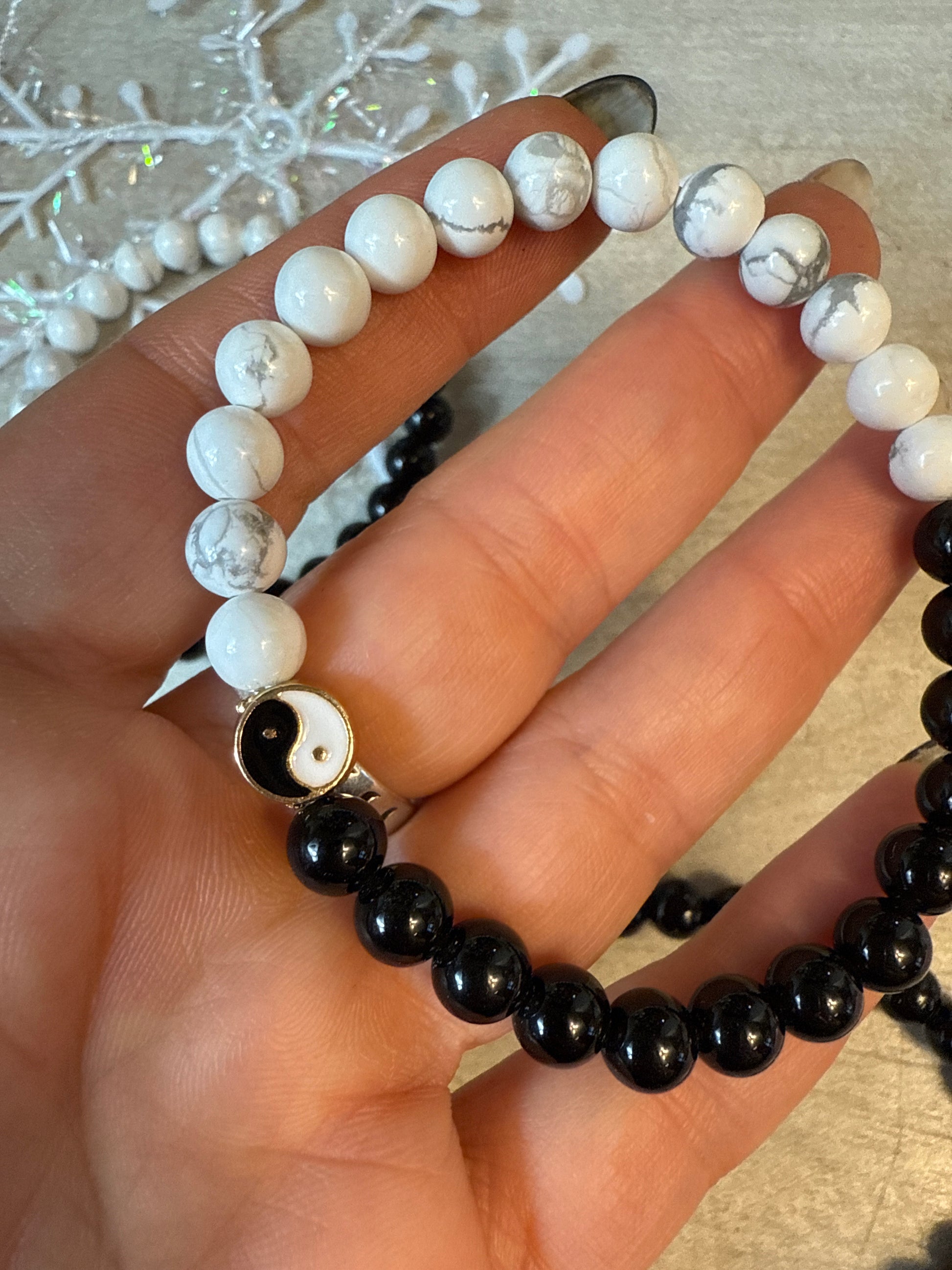 Calming howlite and protective grounding obsidian with a gold double sided Ying Yang charm